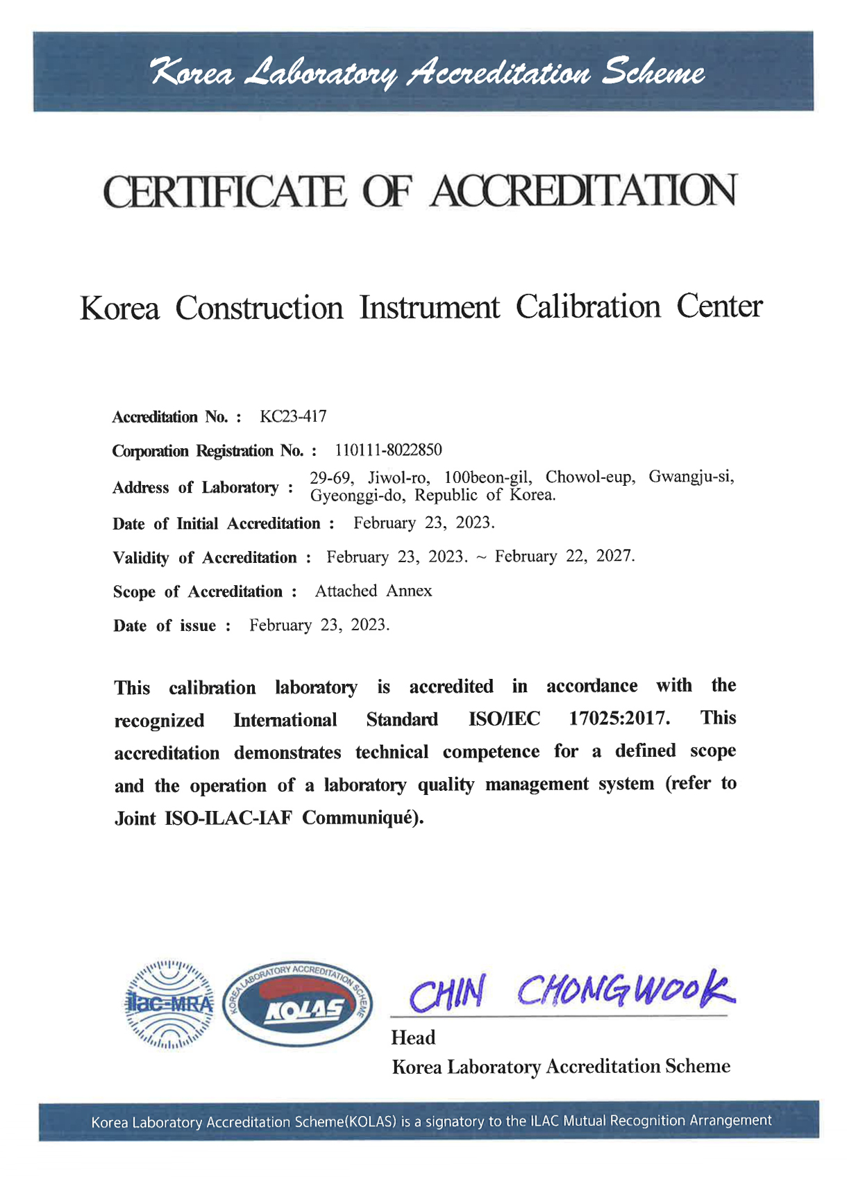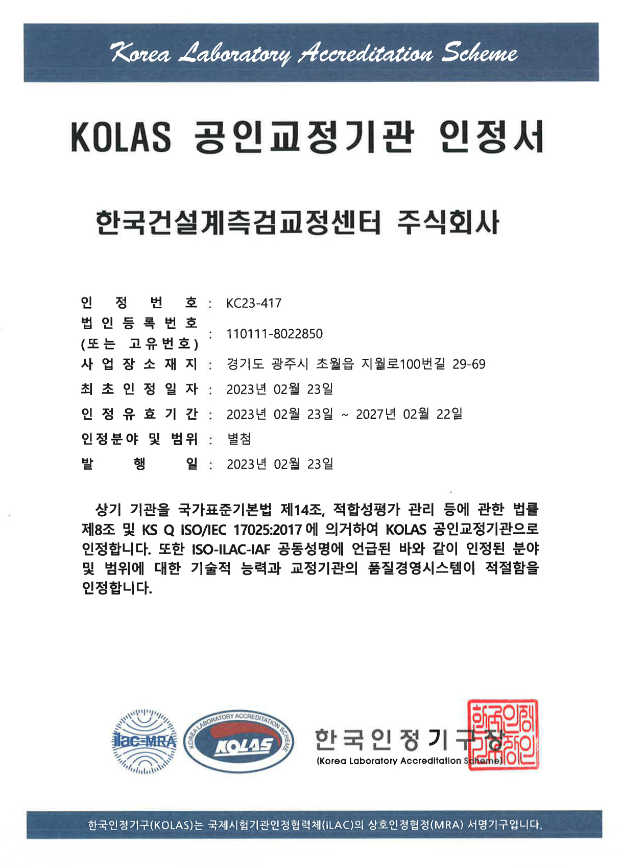 KOLAS 인정서